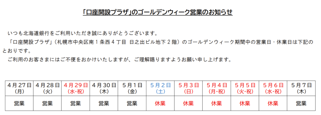 まとめると、ゴールデンウイーク中の北海道銀行窓口の営業時間はこんな感じです↓↓