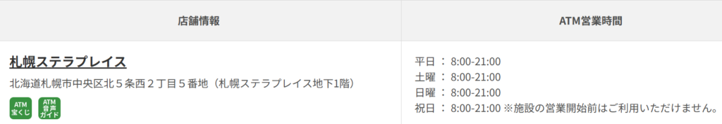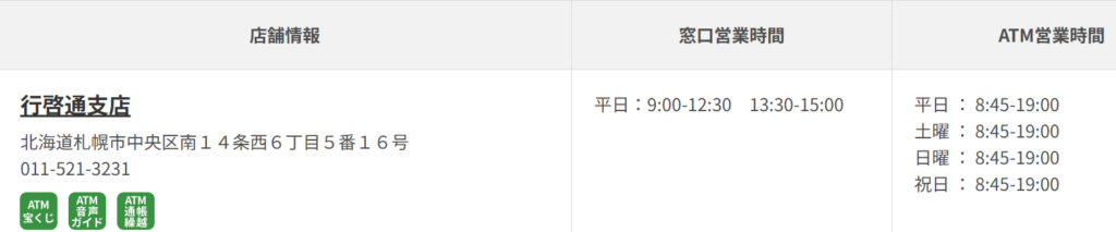 具体的に一つの例を挙げると、札幌の「行啓通支店」は、平日・休日を問わず朝8時45分から夜19時までATMが使えます。