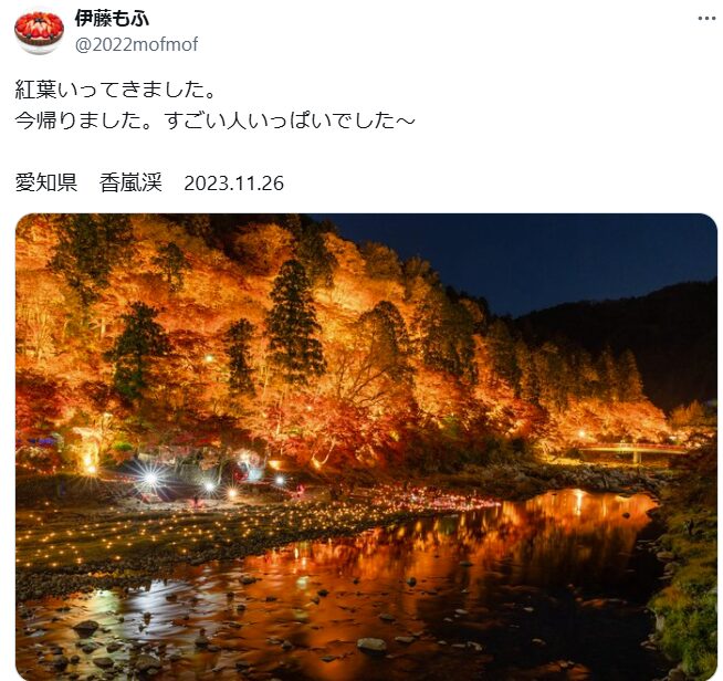 太陽の光を浴びてキラキラと輝く昼間の紅葉ももちろん最高ですが、日が暮れてからの香嵐渓はまた別世界。