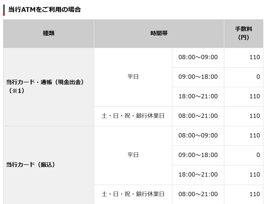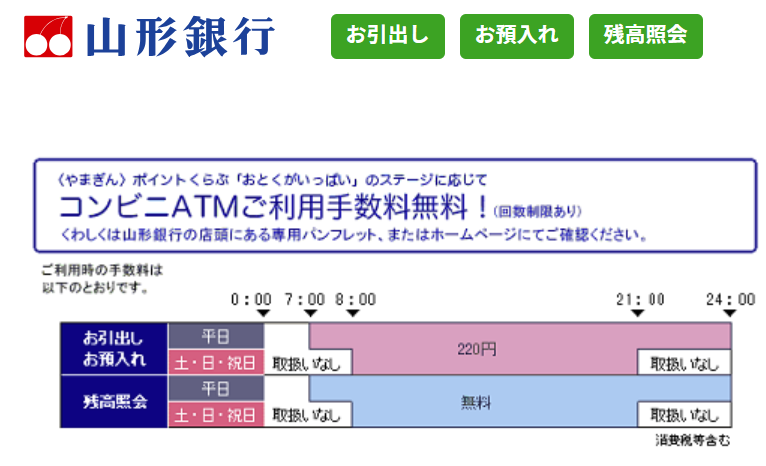 ちなみに山形銀行の店舗ATMも、平日の9時〜18時は無料ですが、それ以外や土日祝は110円かかります。