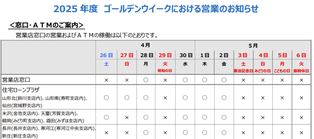今回のGWについては、山形銀行から特別な案内は見つかりませんでした。