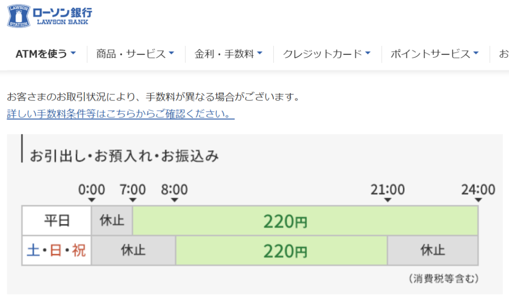 セブン銀行やローソン銀行、イーネットの場合、平日は朝7時から深夜24時まで、土日祝は8時から21時までが220円です。