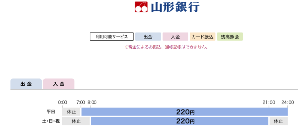 セブン銀行ATMで山形銀行のカードを使う場合、平日は7時〜24時が220円、土日祝は8時〜21時が220円と時間によって手数料が変わります。